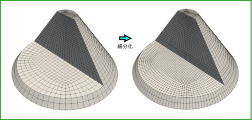 はじめに 下のようなメッシュ細分化を行った際の内容をまとめました。 意地でもヘキサ(ポリヘドラ)メッシュを扱いたいという人向けの内容になっております。 実際はここまでこだわる必要のない場合が殆どだと思いますのでドツボにはまらないようにご注意く…